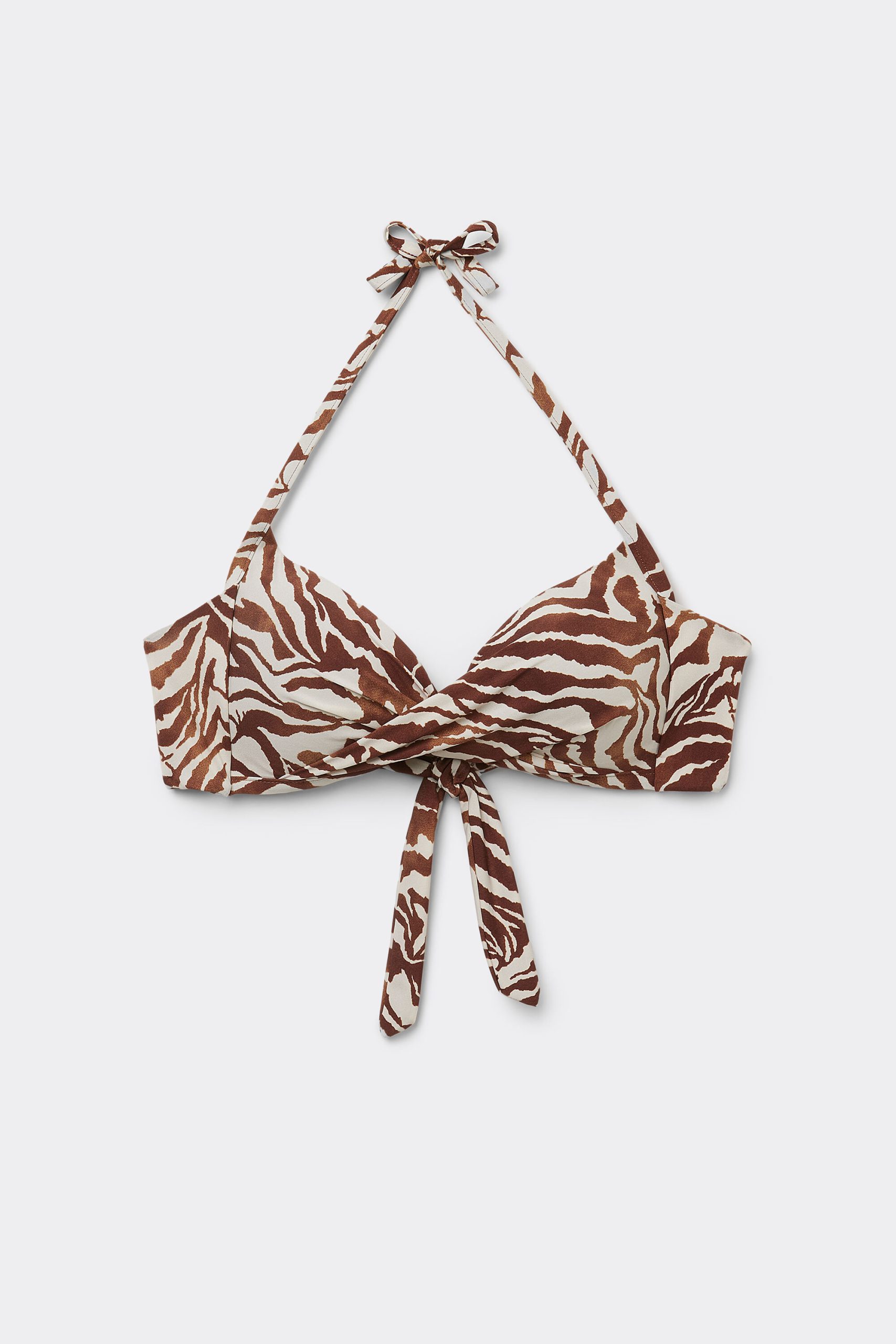 Wireless fixed triangle bikini top with graduated padded cups that add volume. The crisscross on the neckline enhances the décolleté. The style features a sophisticated Brown Zebra print. The shoulder straps have eyelets on the ends so they can be hooked onto the back band or tied behind the neck. Back tie closure. The cups in size XLu002F40 are lightly padded.