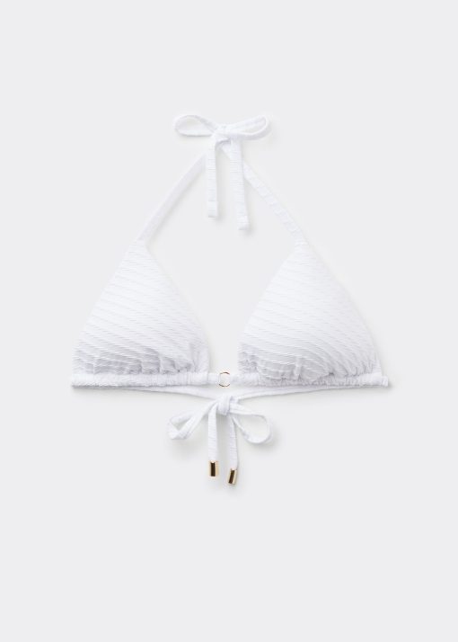 Slide triangle bikini top with removable padding and no underwire for a natural effect. The style features a particularly soft three-dimensional diagonal-motif fabric. The shoulder straps have eyelets on the ends so they can be hooked onto the back band or tied behind the neck. Back string tie closure embellished with silver tips.