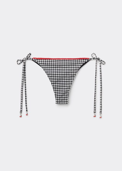 Brazilian cut bikini bottoms with side ties. Made from a vichy pattern fabric, it is enriched by a refined red trim. The slightly rounded waist at the front allows for both a classic or more high-cut fit, depending on one’s physique. Fully lined with invisible seams.